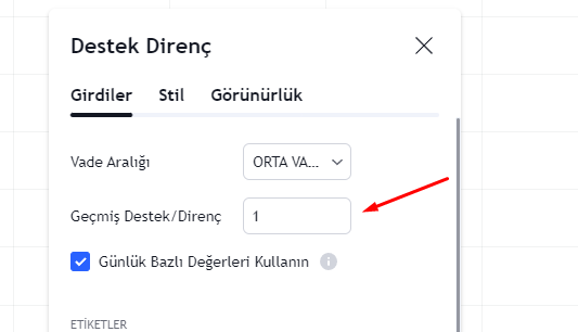 Destek ve dirençlerin geçmişte nasıl çalıştığını görmek için ayarlar girdiler bölümündeki “geçmiş destek direnç 1 ” yazan yere 2 ile 10 arası bir rakam yazıp tamam butonuna basınız.
