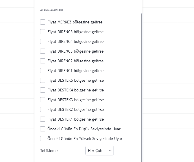 Destek direnç indikatöründe bir alarm kurmadan önce mutlaka aşağıdaki seçeneklerden birini yada bir kaçını aktif ediniz.