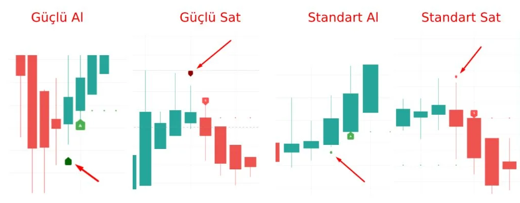 Sinyal gücü seçeneği erken uyarı sinyallerinin çeşidini ayırt etmek için bırakılmış özel bir seçenektir. Trendin güçlümü yoksa standart mı olduğunu işaretlere bakarak anlayabilirsiniz. Bu ayarı çok fazla düşürdüğünüzde, her trendi güçlü olarak gösterecektir. Aşağıda işaretlerin anlamları ve şekilleri belirtilmiştir.